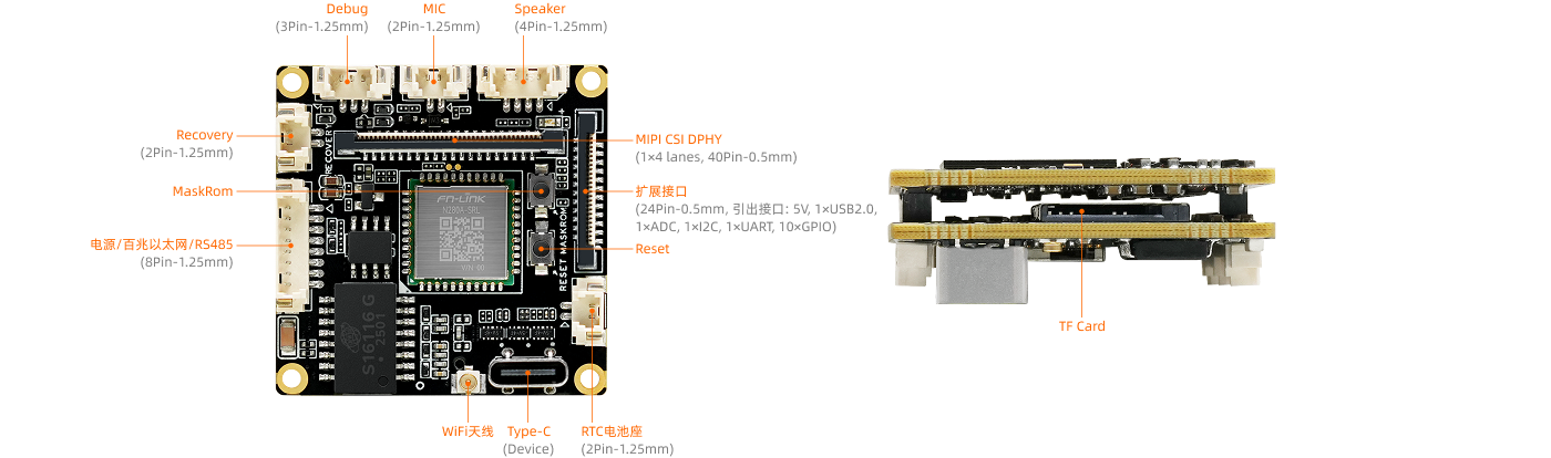1 × 扩展接口(24Pin-0.5mm的FPC连接器,引出:5V、1×USB2.0、1×ADC、1×I2C、1×UART、10×GPIO)、1 × RS485(通过8P-1.25mm的Wafer座引出)、 1 × RTC电池座(2Pin-1.25mm)、1 × Debug(3Pin-1.25mm)、1 × Recovery(2Pin-1.25mm) |