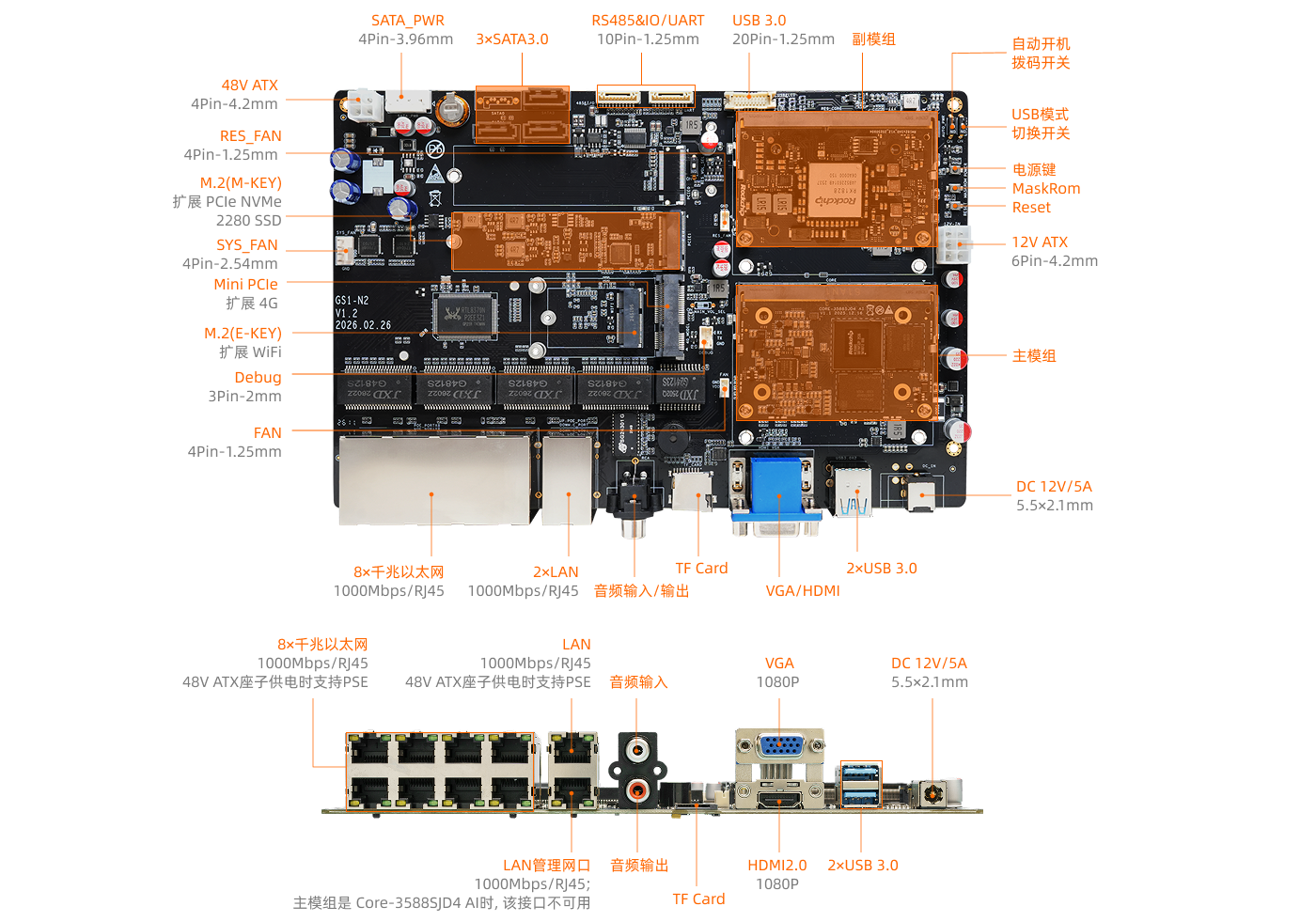 ● 8 × 千兆以太网 (RJ45):外部 48V ATX 电源接入后,支持 PSE 功能,可向终端设备提供 POE 供电 ● 2 × LAN (RJ45, 1000Mbps): ○ 上层 LAN 端口支持 PSE 功能(外部 48V ATX 电源接入后,可向终端设备提供 POE 供电) ○ 下层 LAN 为管理网口(当主模组为Core-3588SJD4 AI时,管理网口不可用) ● 2.4GHz/5GHz双频WiFi(通过M.2 E-KEY扩展,与SATA1复用) ● 4G LTE(通过Mini PCIe扩展,主模组是Core-3576JD4时,该接口不可用) |