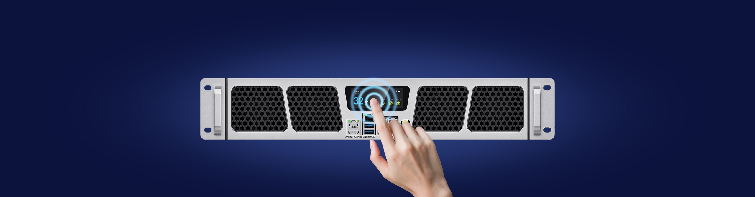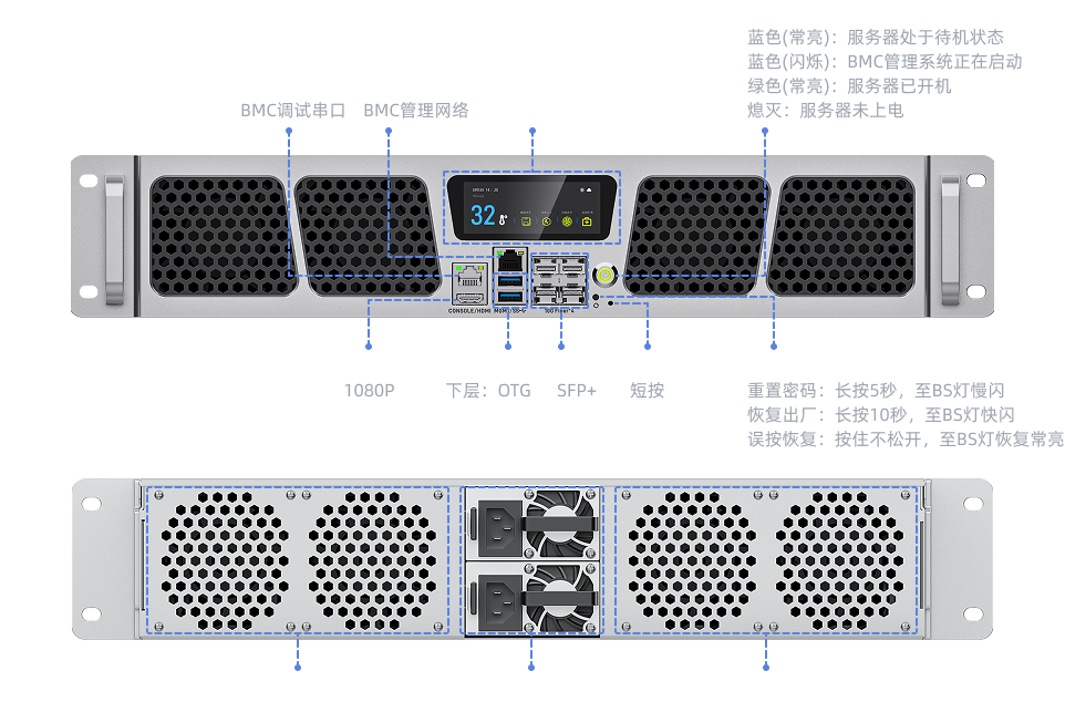 配备 1 个触摸显示屏,可实时显示机箱温度、使用能效、风扇转速、网络IP、日期、时间等设备信息,方便用户随时掌握设备运行状态