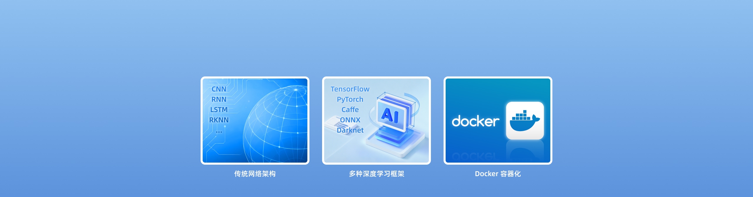 支持 CNN、RNN、LSTM 等传统网络架构,支持多种深度学习框架,包括 TensorFlow、PyTorch、PaddlePaddle、ONNX 等;支持自定义算子开发、Docker 容器化管理技术