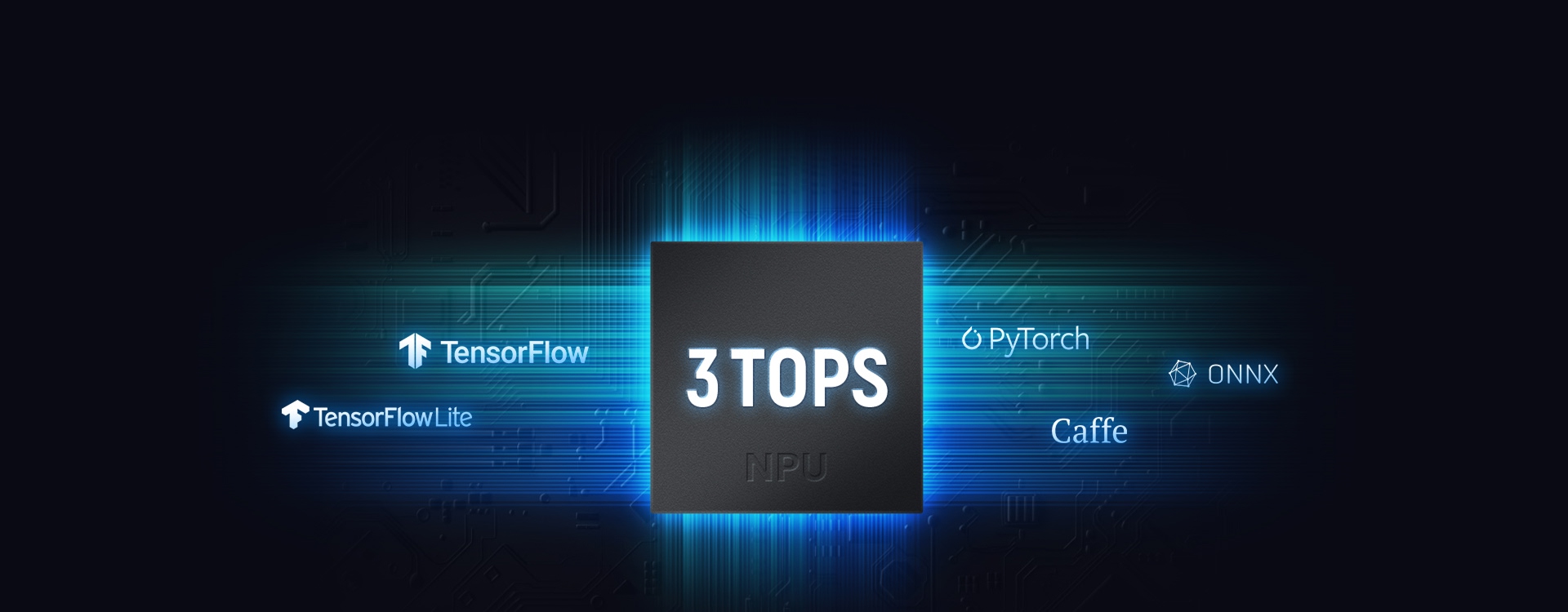 内置 3 TOPS NPU,支持 INT4 / INT8 / INT16 / FP16 混合运算,支持 TensorFlow、TensorFlow Lite、Pytorch、Caffe、Onnx 等深度学习框架,能进行智能的数据处理、语音识别、图像分析,满足绝大多数终端设备边缘计算 AI 应用需求