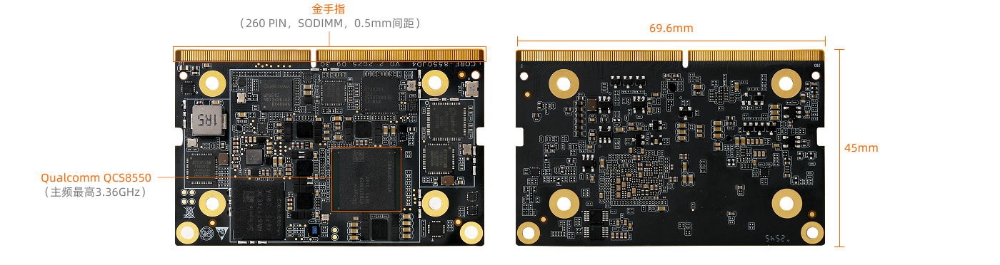 采用高通八核高性能 AI 处理器 QCS8550,集成 48 TOPS NPU,支持多种主流 AI 大模型和深度学习框架。内置 Adreno 740 GPU,支持光线追踪技术、8K 视频编解码。搭载认知 ISP,支持 1 亿像素单摄或 3600 万像素三摄。采用 260P 金手指接口,尺寸小巧轻盈。广泛适用于机器人、无人机、摄像头、边缘计算 AI、云游戏、算力服务、智能安防、智能家居等行业领域