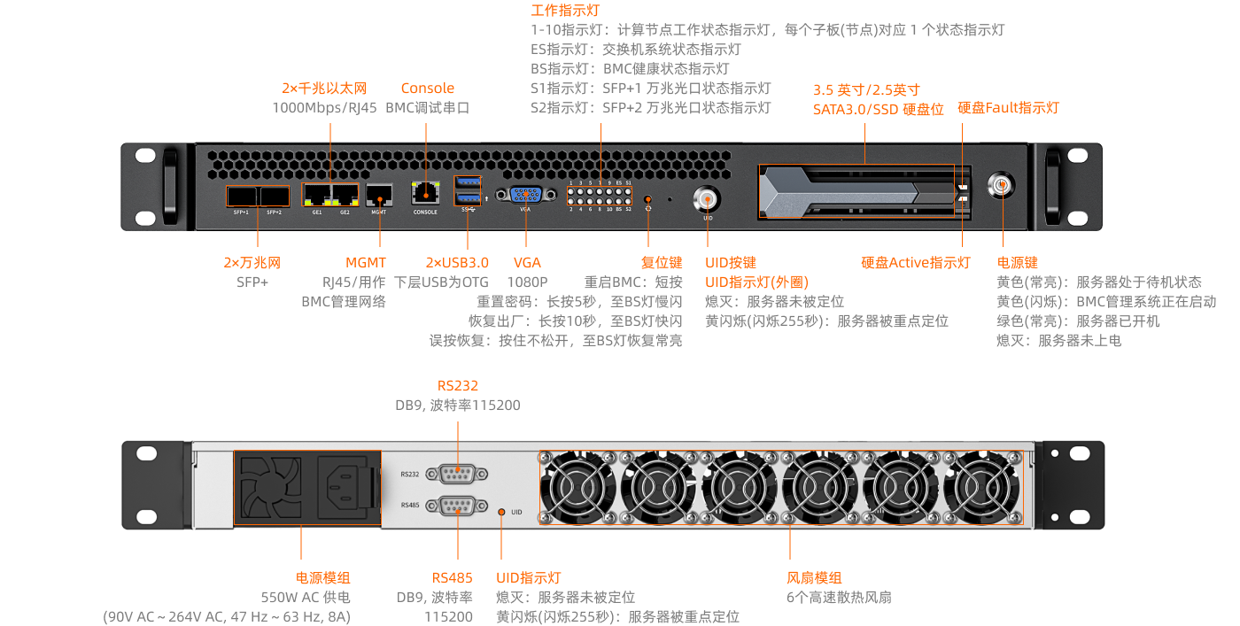 550W AC 电源(输入: 90V AC~264V AC, 47 Hz ~ 63 Hz, 8A)(不支持热插拔) |