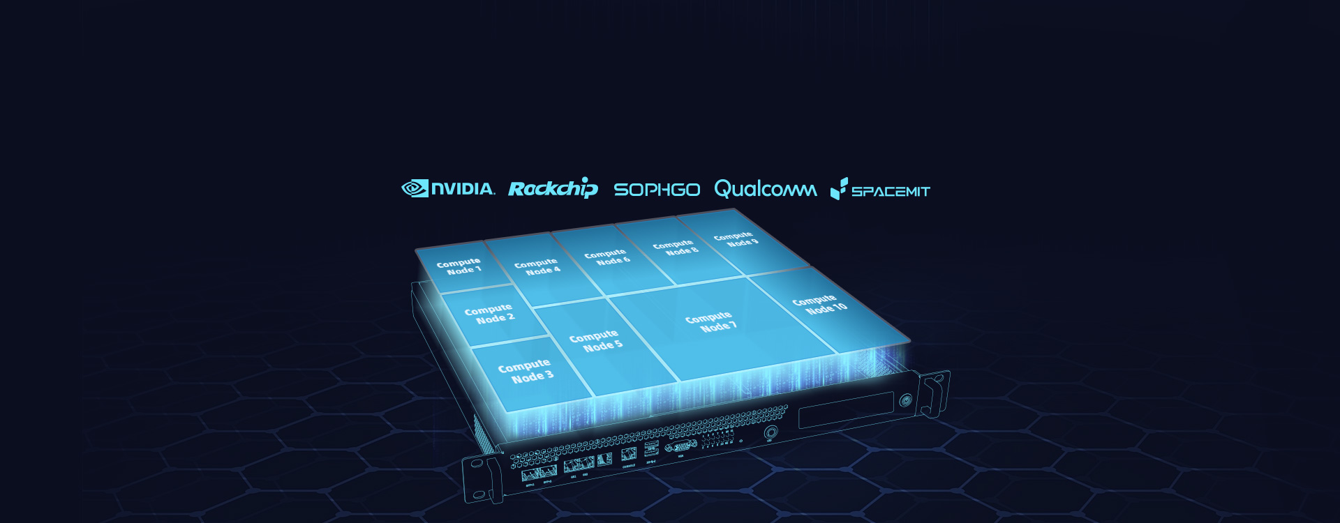 服务器内置 10 个分布式计算节点,单节点可提供 6 -157 TOPS 算力,可选瑞芯微、算能、NVIDIA、高通、进迭时空等平台。支持主流 AI 大模型的私有化部署、多种深度学习框架。拥有 2 个万兆网口和千兆网口,可扩展 SATA 3.0 硬盘。配套智能管理系统,标准的 1U 机架服务器机箱设计,广泛适用于边缘计算、大模型本地化、智慧城市、智慧医疗、智慧工业、智能安防等产品和领域