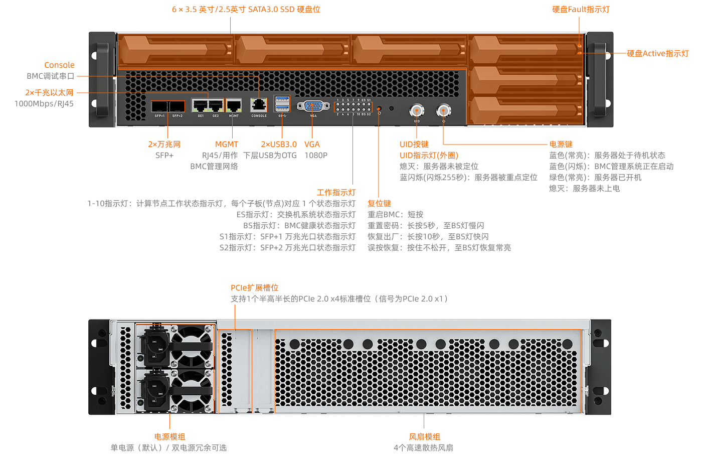 3.5 英寸/2.5英寸 SATA3.0/SSD 硬盘位 × 6(支持热插拔;BMC可直接操作硬盘,计算子节点可通过BMC提供的网络共享方式,间接访问硬盘) |