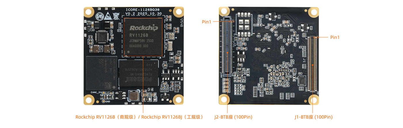 采用 Rockchip 四核 AI 视觉处理器 RV1126B,集成 3 TOPS NPU,支持 2B 多模态大模型和深度学习框架。支持 12M 视频编码,4K 视频解码。内置 12M ISP / 8MP AI-ISP,功耗低。硬件 AI Remosaic, 白天超高清,夜晚超低照,支持多目 AI 动态拼接、流畅自然无割裂感,AI 视频 6 轴数字防抖、多光源融合(RGB 与红外热成像融合、可见光与结构光、ToF 融合),支持 AOA 低功耗声音事件检测,内置更安全的国密级 SM2/SM3/SM4 加密算法。尺寸仅 38mm × 38mm,广泛适用于人脸识别、闸机门禁、智能安防、智能网络摄像头等行业领域