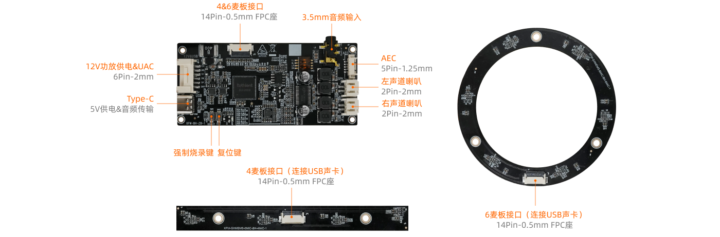 1 × 12V功放供电&UAC(6Pin-2mm)、1 × Type-C(5V供电&音频传输)、1 × 4&6麦板接口(14Pin-0.5mm FPC座)、1 × 3.5mm音频输入接口、 1 × AEC接口(5Pin-1.25mm)、1 × 左声道喇叭(2Pin-2mm)、1 × 右声道喇叭(2Pin-2mm) |