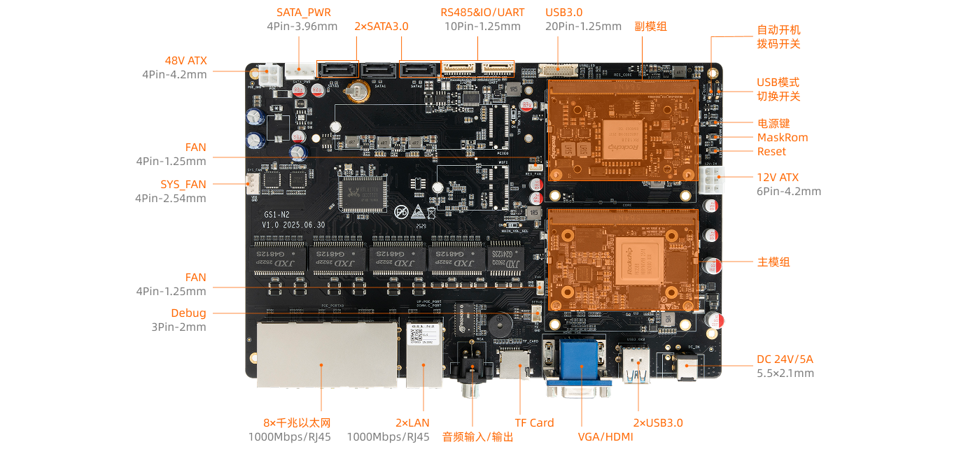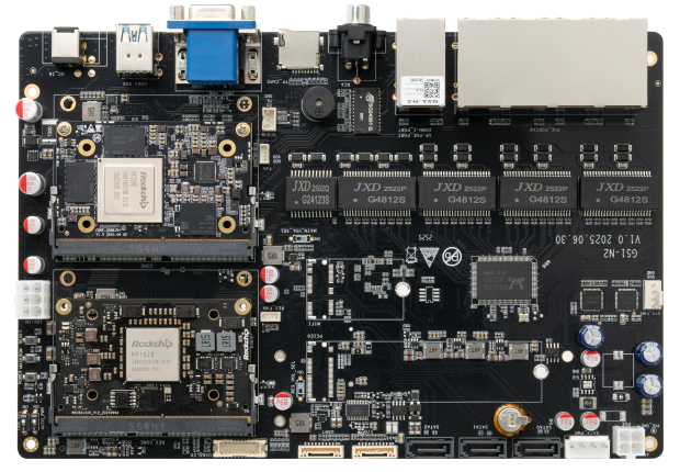 采用 Rockchip 高性能 AI 双芯方案,主模组统筹任务调度与数据预处理,RK182X 专注 AI 推理,其集成 20 TOPS NPU 与 3D RAM 堆叠架构,凭超高 DRAM 带宽可流畅运行 3B/7B 参数大模型,本地 AI 实时处理达毫秒级响应。硬件接口丰富,板载 10 个千兆网口,广泛适配智能网关服务器、机器人、AI 边缘计算、工业自动化、企业安防、交通管理、智慧城市、家庭存储等产品和领域