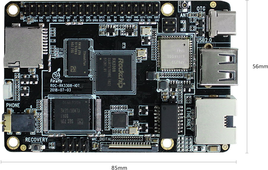 RK3308B核心板搭配底板组合成的微型IoT主板,集成高性能Codec和Hardware VAD,可配置远场麦克风阵列板,支持多种IoT系统和服务,适用于IoT智能物联网、智能语音识别、人机界面、工业控制、智能机器人等领域。